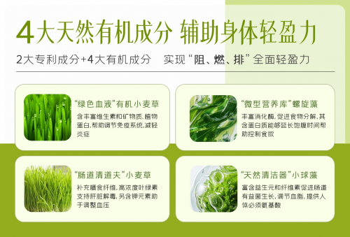 Melrose麦萝氏绿瘦子2.0配方结合四大天然有机成分,为身体注入多重轻盈能量。“绿色血液”有机小麦草,富含维生素、矿物质及植物蛋白,有助于维持免疫系统的正常运作;“肠道清道夫”小麦草,高膳食纤维与叶绿素赋能,能够为肝脏提供营养支持,同时助力肠道环境的日常维护;“天然清洁器”小球藻:以益生元与纤维素促进有益菌生长,提供人体所需氨基酸,构建肠道良性生态,小球藻所含有的特定营养成分与血脂水平的调节存在关联;“微型营养库”螺旋藻:丰富消化酶促进食物消化,丰富蛋白质带来的饱腹感有助于日常饮食管理。四种天然有机成分协同作用,从多方面为健康生活提供营养助力。